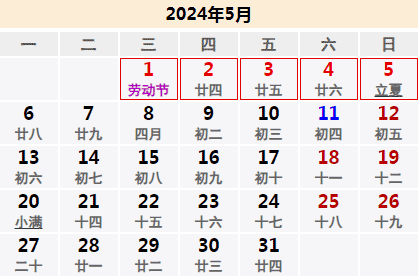 2024年五一劳动节放假时间表:根据国务院办公厅关于2024年部分节假日安排的通知,2024年五一劳动节放假时间为5月1日(星期三)至5日(星期日),而4月28日(星期天)和5月11日(星期六)则需要上班(放假时间见图上红框时间)。