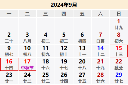 2024年中秋节(农历八月十五)是9月17日(星期二)。