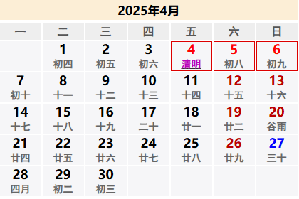 2025清明节放假时间为4月4日(星期五)至6日(星期天),由于清明节4月4日为星期五,因此今年清明节请假无调休。