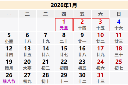 根据国务院办公厅2026年节假日安排的通知,2026年元旦节放假3天,时间为1月1日(星期四)至1月3日(星期六),但1月4日(星期日)需要上班。也就是元旦节前我们需要上3天班,然后放3天假,节后则要上6天班。而下一个假日(春节)则在元旦节后还要等待40多天。