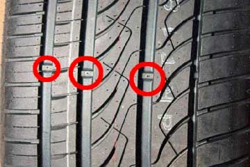 轮胎四周花纹中有数条磨损线(如上图红圈所示),当轮胎花纹被磨损掉并且接近或到达磨损线时,则需要立即更换轮胎。