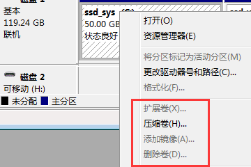 4 在需要扩容的系统分区所在硬盘的节点上,删除系统分区以外的分区(在分区上点击鼠标右键,选择[删除卷],如上图所示,如果是系统分区或分区上有虚拟内存则[删除卷]不可用);
